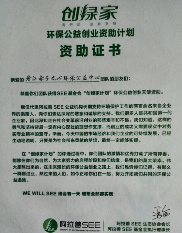 日前,靖江赤子之心环保公益中心团队收到阿拉善SEE生态协会会长、阿拉善SEE基金会执行理事长冯仑先生寄来的“创绿家计划”环保公益天使资助证书,冯仑先生对赤子之心团队长期专注环境保护工作表示深深的敬意和诚挚的支持。在“创绿家计划”的评选过程中,靖江赤子之心环保公益中心团队的激情和优秀打动了所有评委,成功获得“创绿家计划”环保公益天使资助。