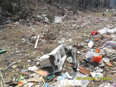 图片内容是:德诚城市广场有一幢未拆迁的老式废旧的居民区。垃圾到处可见,并且也无清扫人员打理。