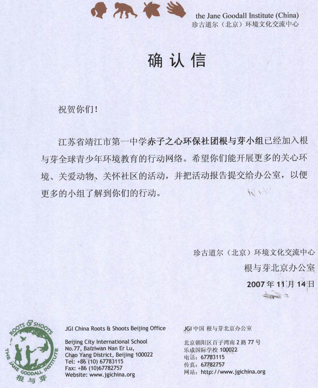 江苏省靖江市第一中学赤子之心环保社团根与芽小组已经加入根与芽全球青少年环境教育的行动网络。希望你们能开展更多的关心环境、关爱动物、关怀社区的活动,并把活动报告提交给办公室,以便更多的小组了解到你们的行动。
